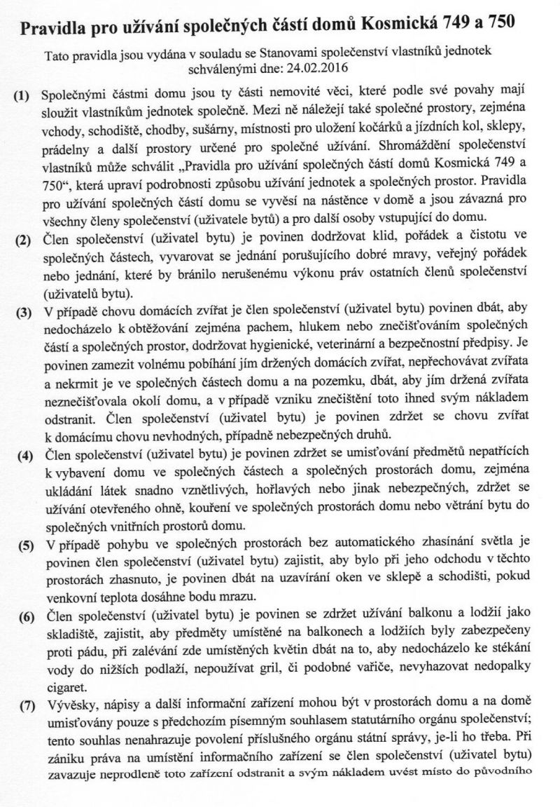 Pravidla pro užívání společných částí domů Kosmická 749 a 750 ke stažení ZDE